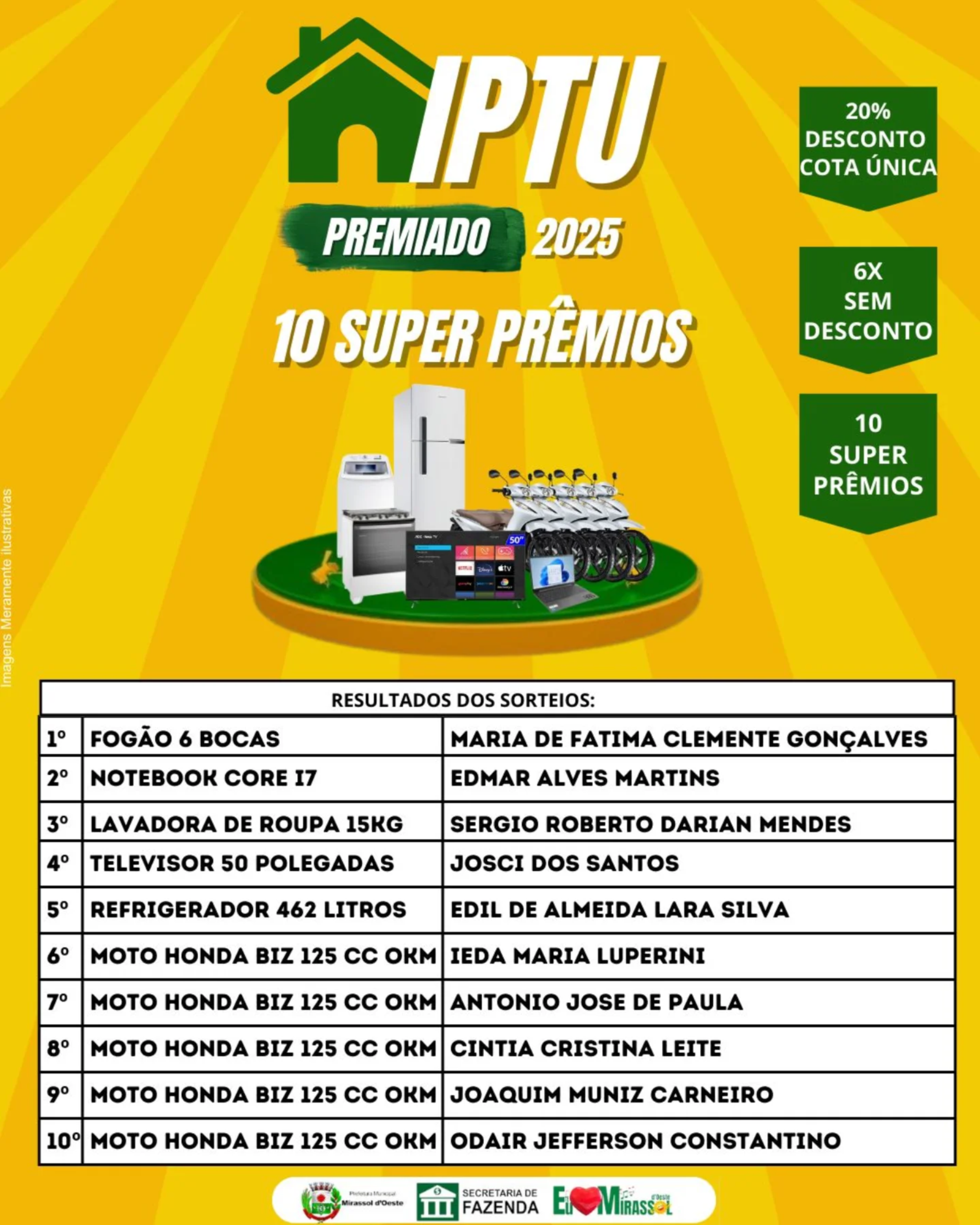 De acordo com a Prefeitura, o IPTU Premiado integra o programa de incentivo fiscal municipal, que também garantiu aos contribuintes 20% de desconto para pagamento em cota única e a possibilidade de parcelamento em até 6 vezes sem desconto. A iniciativa busca fortalecer a arrecadação municipal e, ao mesmo tempo, reconhecer o esforço dos moradores que mantêm seus tributos em dia.