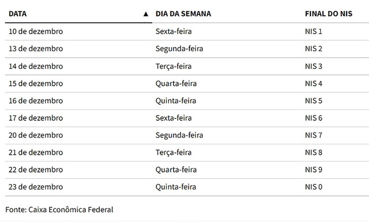 O pagamento do mês de dezembro será concluído para beneficiários com NIS final zero, no dia 23 de dezembro, conforme o calendário previamente divulgado. Confira as datas: