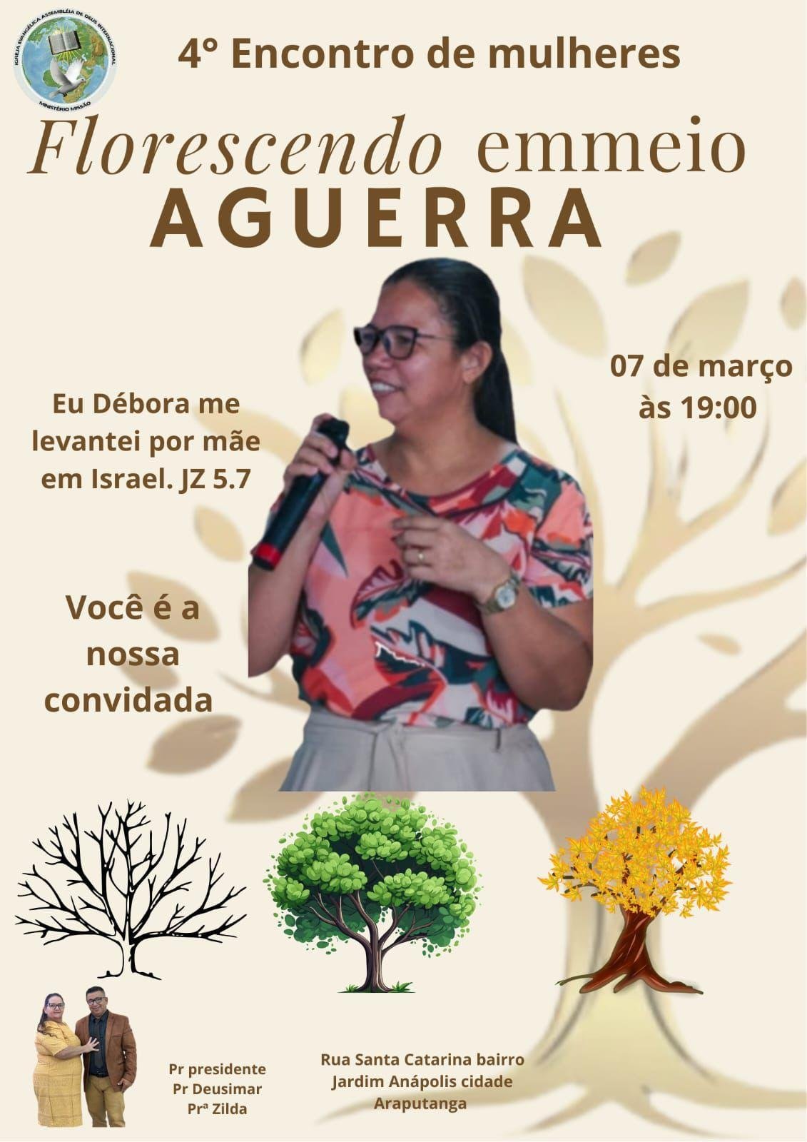 A Igreja Assembleia de Deus Ministério Missão, em Araputanga (a 345 km de Cuiabá), realizará neste sábado, 7 de março, às 19h, o 4º Encontro de Mulheres, com o tema “Florescendo em Meio à Guerra”.
