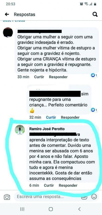 Após compartilhar uma publicação do presidente da Conferência Nacional dos Bispos do Brasil (CNBB), o padre Ramiro José Perotto, de Carlinda (762 km ao norte de Cuiabá), afirmou que a menina de 10 anos, vítima de estupro no Espírito Santo, “gosta de dar”. O print do comentário circula nas redes sociais.