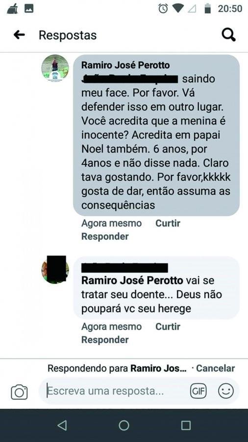 O padre então respondeu, dizendo para a mulher “aprender interpretação de texto”. Em outro comentário, ele ainda duvida da inocência da menina. “Você acredita que a menina é inocente? Acredita em papai Noel também. 6 anos, por 4 anos e não disse nada”.
