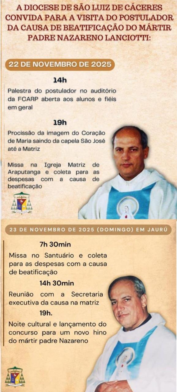 O postulador da causa de beatificação do Padre Nazareno Lanciotti, padre Enzo Gabrieli, cumprirá uma programação religiosa e cultural nos municípios de Araputanga e Jauru, nos dias 22 e 23 de novembro de 2025. A visita foi confirmada pela Diocese de São Luiz de Cáceres.