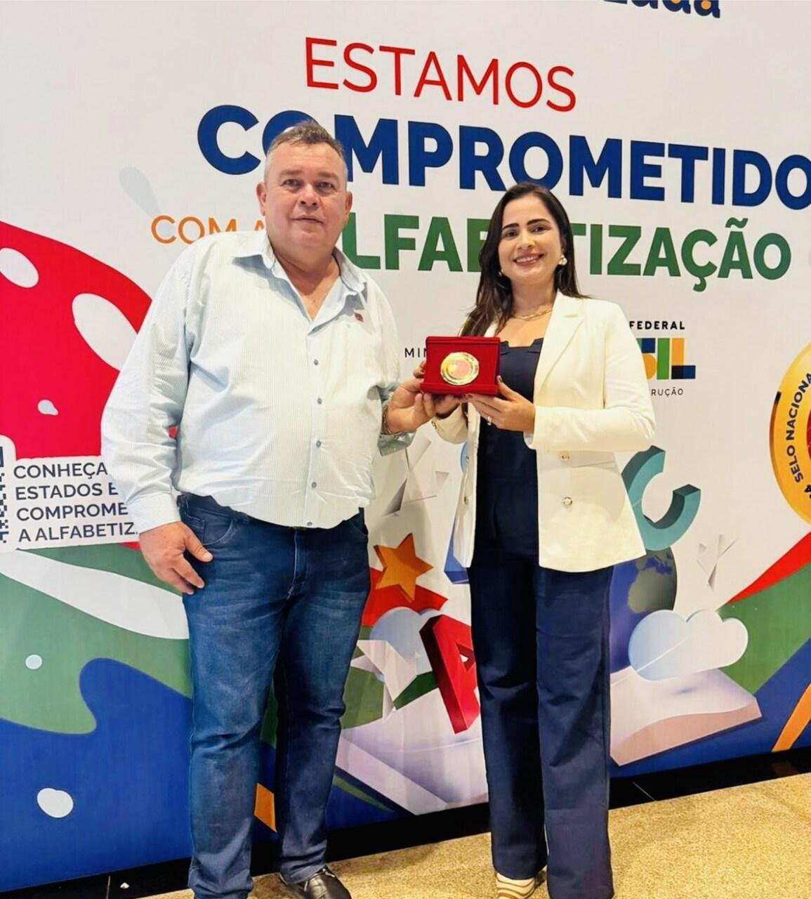 Juntamente com o secretário de Educação, a prefeita participou da cerimônia de entrega, realizada na segunda-feira, 10 de fevereiro, em Brasília (DF). "Viemos receber mais um prêmio valioso para a educação do nosso município. Estamos recebendo um selo de compromisso com a alfabetização de nossas crianças", afirmou.